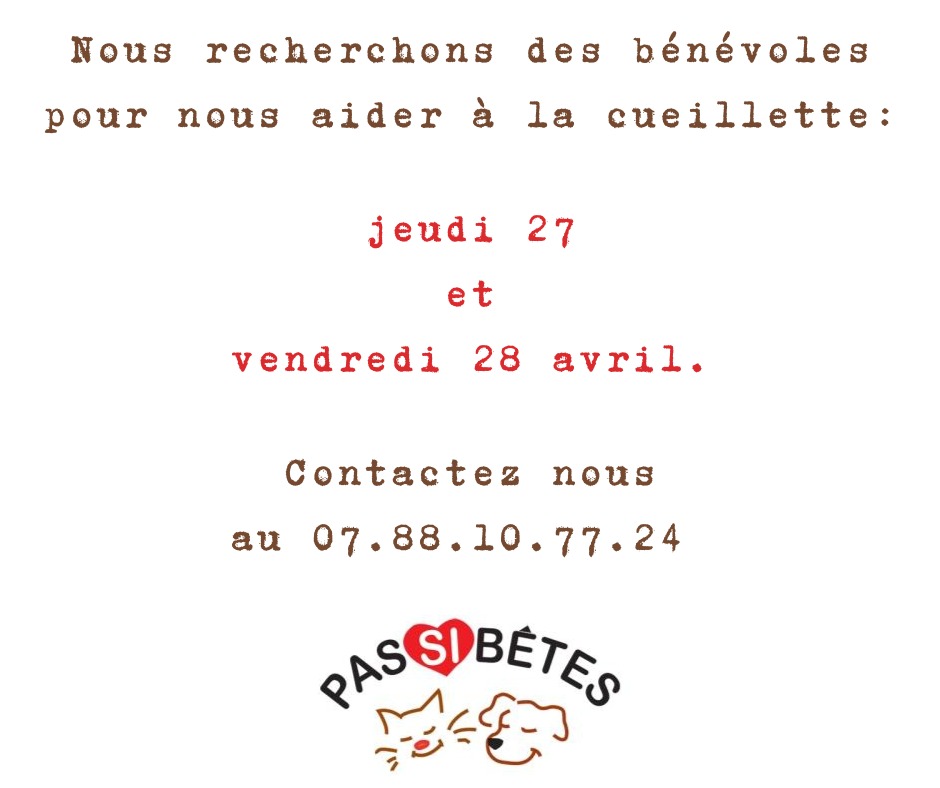 Nous recherchons également des bénévoles pour nous aider à la cueillette les jeudi 27 et vendredi 29 avril.