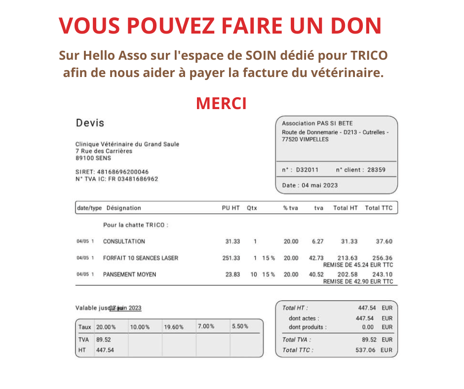 MERCI encore à vous tous pour l’aide apportée, à la famille d’accueil qui gère les aller-retour chez le vétérinaire et à la clinique de Sens.