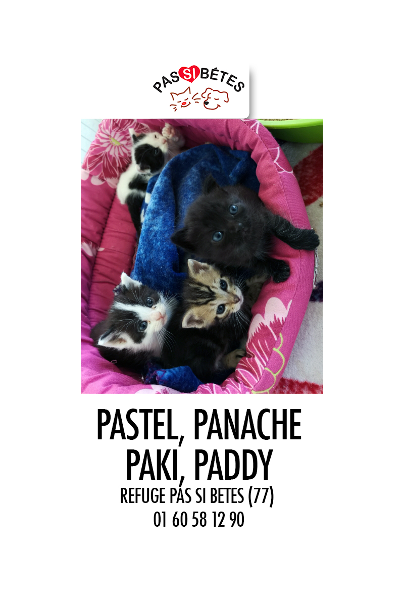 Pastel est le mâle tigré. Panache est le mâle noir. Paddy est le mâle noir et blanc et Paki est la femelle noire.