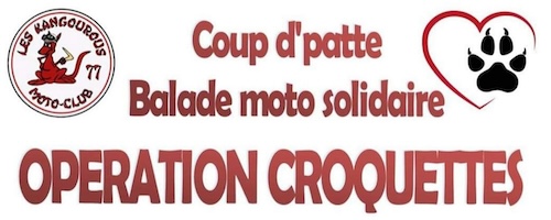 Opération au profit de notre refuge Coup d’patte – Balade à moto solidaire : Opération Croquettes Organisée par Les Kangourous – Moto Club de la Vallée du Loing. Balade moto solidaire Balade de 110 km. Au profit des animaux du refuge Pas si bêtes de Vimpelles (77), participation en nature : Croquettes pour chien et/ouLireLire la suite « Coup d’patte – Balade à moto solidaire »