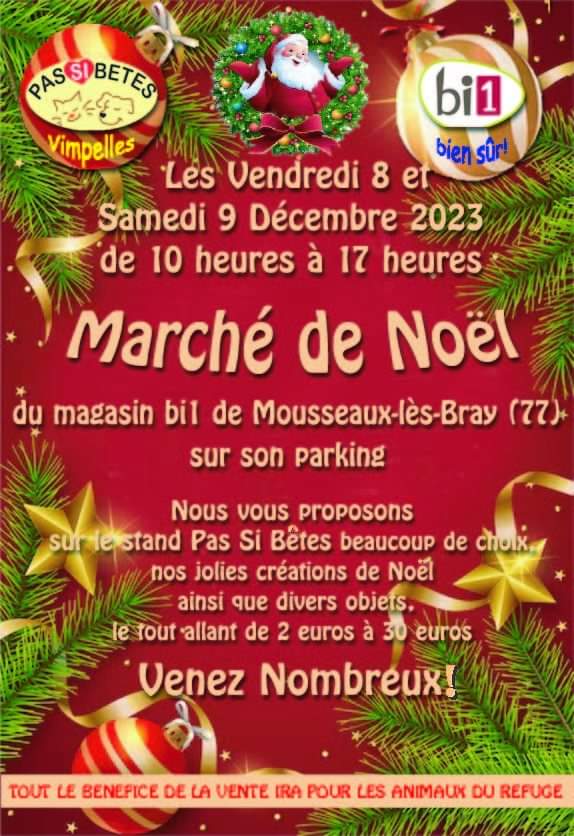 En plus de notre Noël des Animaux au refuge, nous vous donnons rendez-vous le week-end suivant au Marché de Noël du magasin Bi1 de Mousseaux-lès-Bray. Nous vous proposerons sur notre stand nos jolies créations de Noël ainsi que divers objets en vente à partir de 2€. Tout le bénéfice de la vente ira évidemment pourLireLire la suite « Marché de Noël à Mousseaux-lès-Bray »