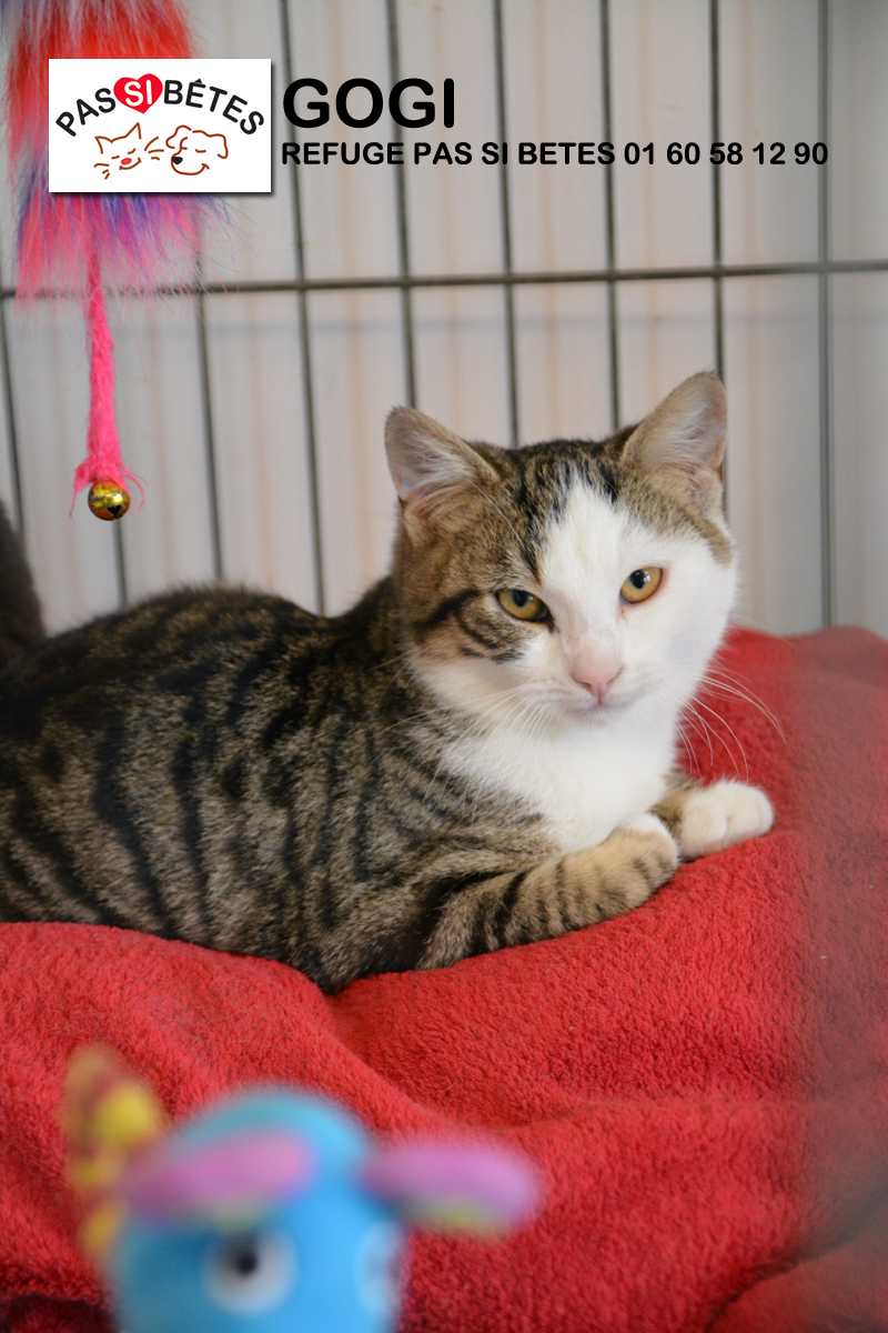 Gogi vivait auparavant dans un entrepôt où il n’était pas le bienvenu. Il est craintif mais il fait des progrès de jour en jour. Un petit gourmand très attachant.