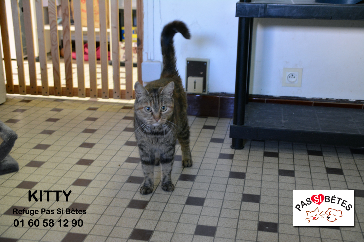 Kitty a été abandonnée suite aux déménagement de ses propriétaires. Kitty souffre d’un problème neurologique (peut-être la conséquence d’un accident) ce qui lui donne une démarche chaloupée et l’empêche de sauter haut. Kitty adore les caresses et flemmarder au soleil.