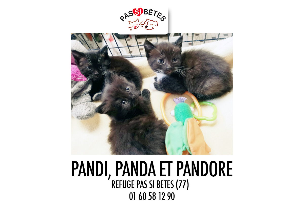 Mâles âgés d’environ 6 semaines. Panda est noir avec un « bavoir » blanc, Pandore est le noir angora et Pandi a des « chaussettes » blanches.