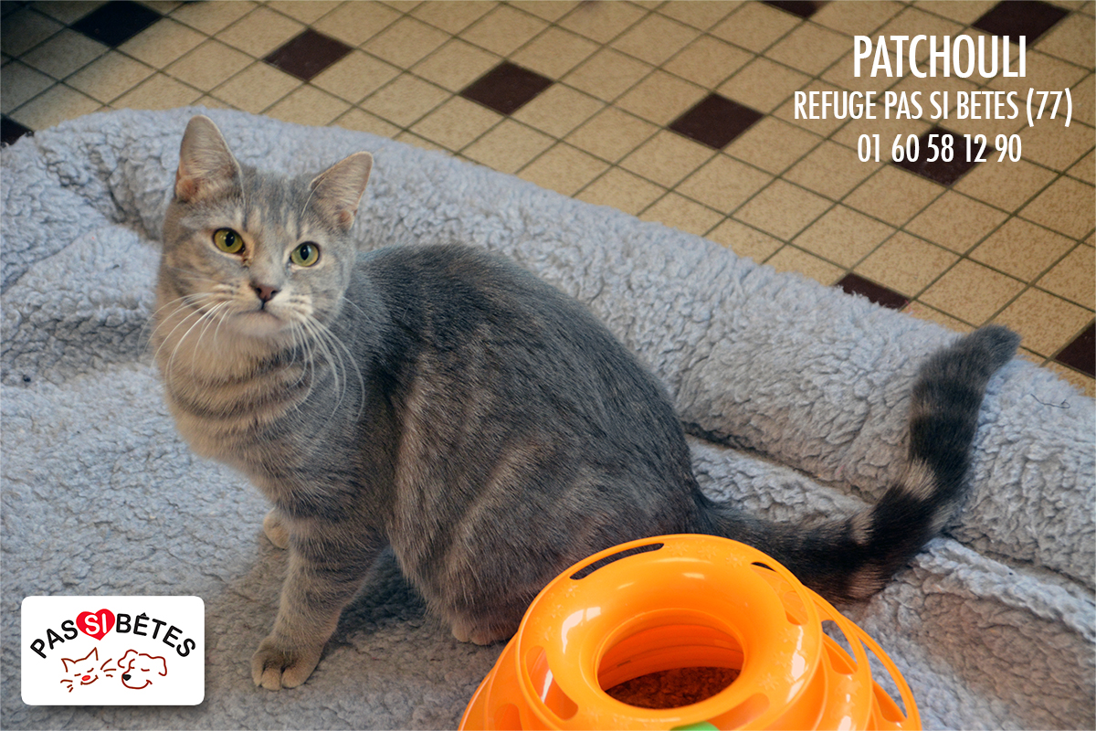 Patchouli est une belle chatte. Joueuse, elle est un peu méfiante au début mais elle apprécie bien volontiers les caresses.
