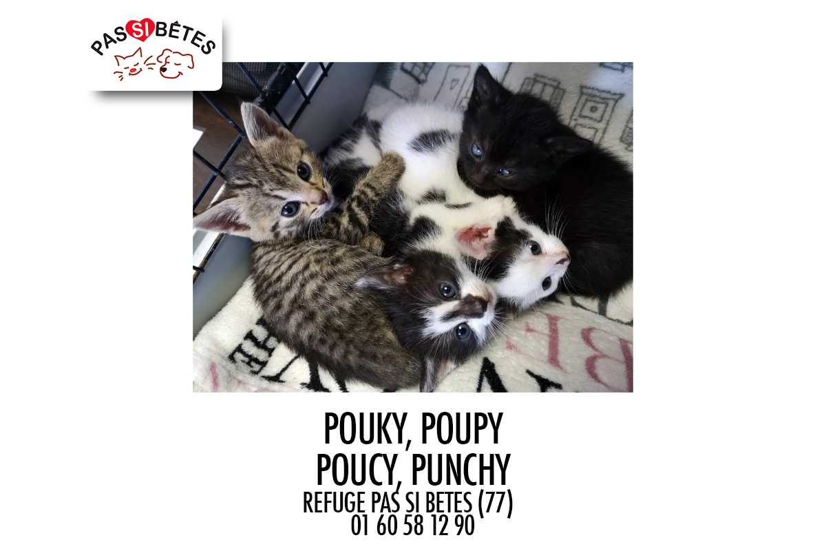 Punchy est le mâle noir et blanc. Pouky est la femelle noire et blanche, Poupy est la femelle tigrée et Poucy est la femelle noire.