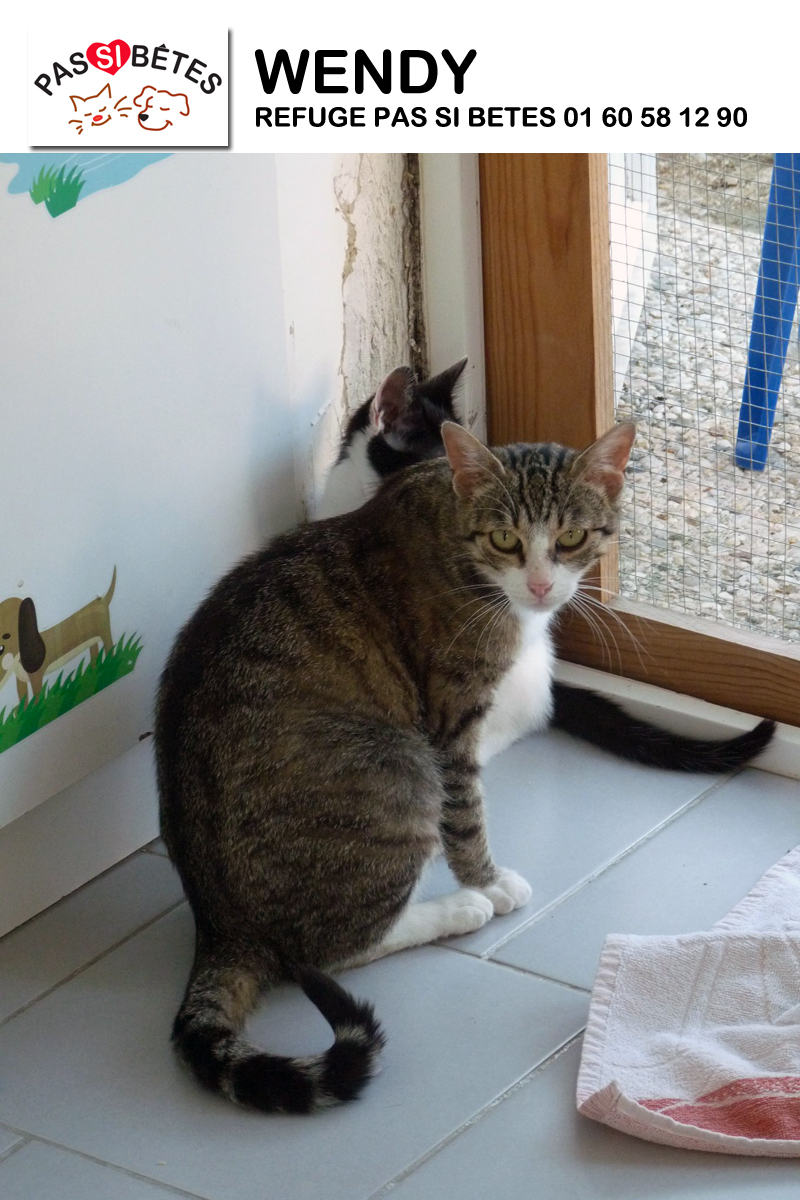 Wendy est une chatte très sympa. Tous ses chatons ont été adoptés au refuge, elle aimerait maintenant trouver sa famille.